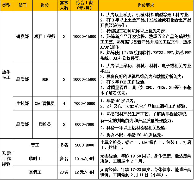 公司擁有廣東省唯一的鋁車體工程技術(shù)研究中心!扳伱冷X材”品牌先后獲得鋁型材行業(yè)內(nèi)的最高榮譽(yù):“中國馳名商標(biāo)”、“中國著名品牌”、“中國名優(yōu)產(chǎn)品”;公司榮獲“國家高新技術(shù)企業(yè)”、廣東省“專精特新”企業(yè)等榮譽(yù)稱號。因生產(chǎn)發(fā)展需要,誠聘以下崗位: